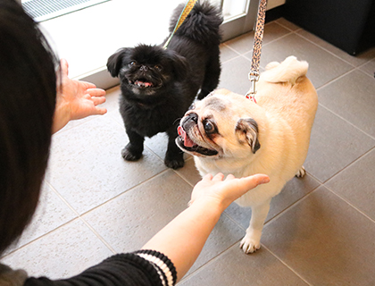 いらっしゃいませ!まずは受付でワンちゃんの体調チェックしていよいよお泊まりスタートです!